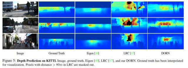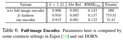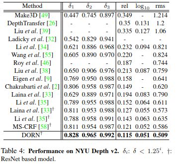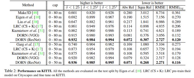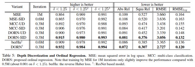 表4 深度离散化和有序回归。根据表中的得分可知,对连续深度的回归训练似乎比其他两种方法收敛的更差,我们的有序回归网络的性能最好。SID和UD离散化有很明显的区别,且用BerHu代替我们的有序回归损失时,DORN仍然能得到更高的分数。