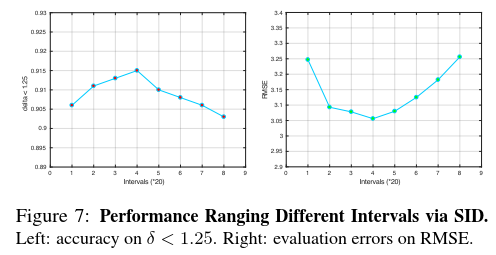 图6 用SID将深度值离散化成多个区间,在40~120个区间中,DORN得分范围为[0.908,0.915], δ < 1.25,在RMSE方面得分为[3.056,3.125],因此对一个较长的区间数是鲁棒的。