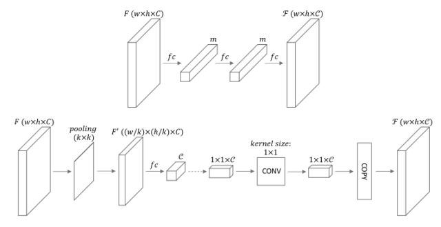 首先用一个小内核和步长的平均池化层来降低空间维度,然后用一个fc层来获得维度为C的特征矢量,把它看做空间维度为1*1的C通道的特征地图,并加入一个内核大小1*1的卷积层来作为跨通道参数池化结构。最后我们沿着空间维度将特征向量复制到F,这样F的每个位置都对整个图像有相同的理解。