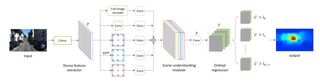 包含一个密集特征提取器,多尺度特征学习(ASPP),跨通道信息学习(纯1*1卷积分支),一个全影像编码器和有序回归优化器。Conv组成全是用1*1内核。ASPP模块包含3个3*3内核的扩张卷积层,扩张比率分别是6,12和18。网络的监督信息是用SID策略离散化输出的深度值。用一个端对端的有序回归训练损失优化整个网络。