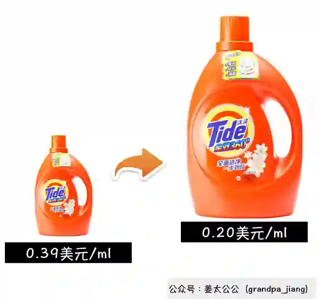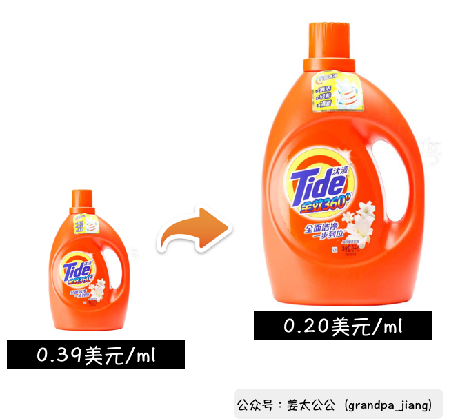 沃尔玛的汰渍洗衣液100毫升,售价39美元,相当于0.39美元/毫升。Costco增大汰渍洗衣液的容量,变成500ml,售价100美元,相当于0.20美元/毫升。薄利多销,买的越多越便宜,自古以来的道理。