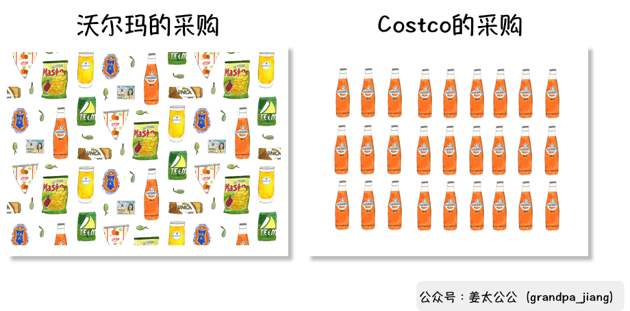 Costco的SKU只有3千多个,沃尔玛的SKU远超3万个,这就意味着如果Costco的门店和沃尔玛门店销售额相同,1件商品Costco的采购量是沃尔玛的10倍。
