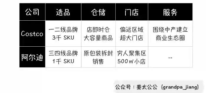 比如下图定位美国中产的Costco和定位穷人区的阿尔迪,两者的价值链的各个环节均有很大的不同: