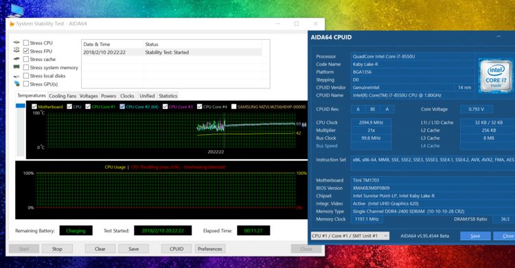 首先是 AIDA64 的 FPU 烤机测试,十分钟之后,小米笔记本 Air 增强版 CPU 的最高温度为 69 度,主频稳定在 2.1GHz,表现不错。