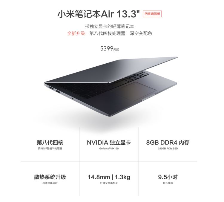 在这三个尺寸中,位于中间的 13.3 英寸的产品最为丰富,根据 CPU、显卡、存储规格的不同,目前共计有 5 个在售的型号。今天我们就聊一聊其中最新的一款,采用全新的深空灰配色以及第八代酷睿 CPU 的小米笔记本 Air 13.3 增强版。