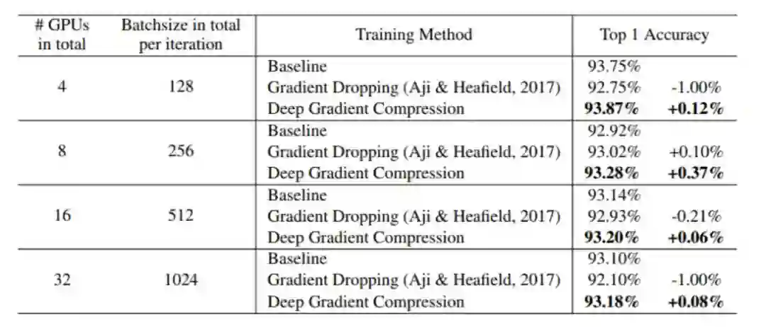 这些实验证明了我们可以对梯度进行 600 倍的压缩而不损失准确率,相比于之前的研究(Aji & Heafield, 2017),DGC 的性能提升了一个量级。