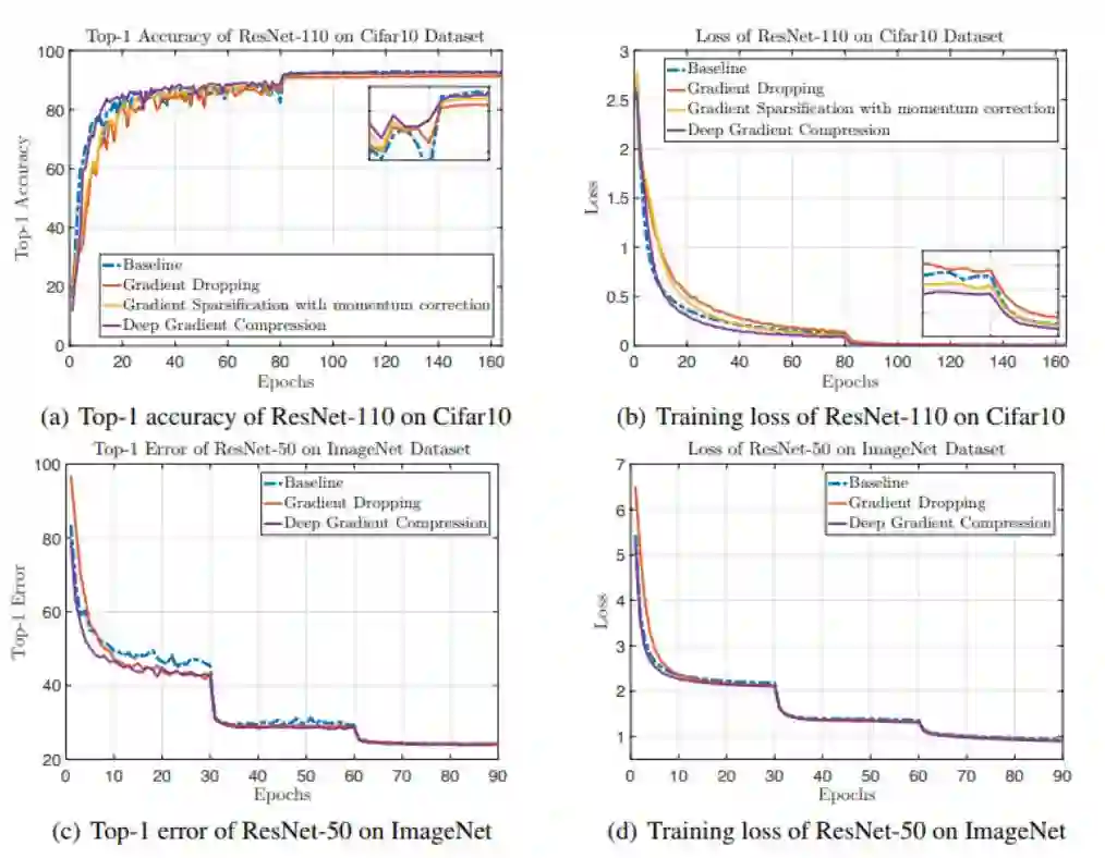 图 3:ResNet 在图像分类任务上的学习曲线(梯度稀疏度为 99.9%)。(a)ResNet-110 在 CIFAR-10 数据集上的 top-1 准确率;(b)ResNet-110 在 CIFAR-10 数据集上的训练损失;(c)ResNet-50 在 ImageNet 数据集上的 top-1 准确率;(d)ResNet-50 在 ImageNet 数据集上的训练损失。