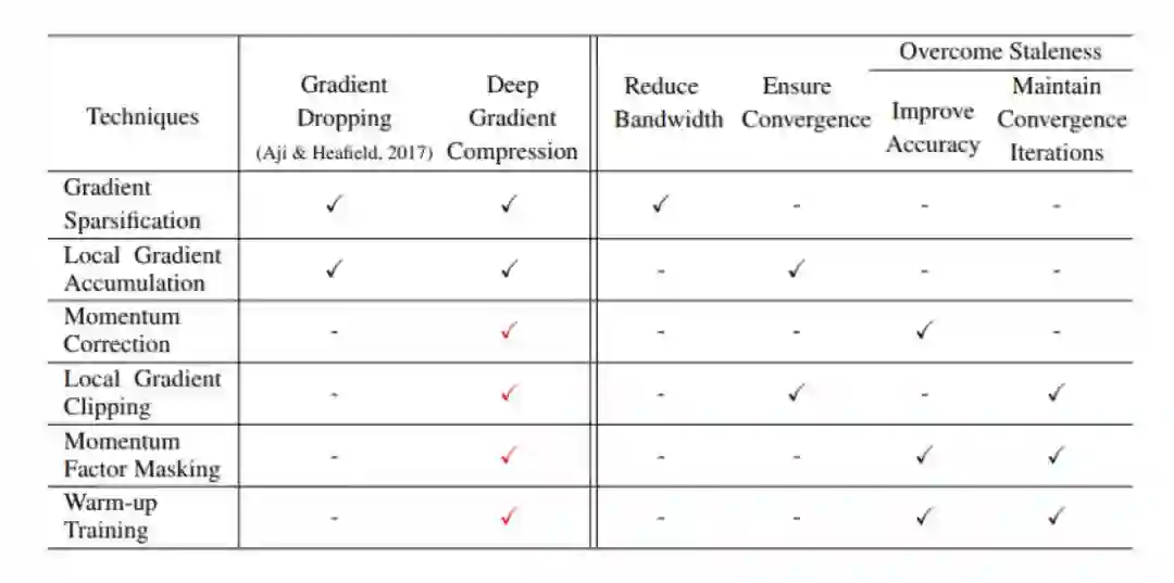 表 1:深度梯度压缩(DGC)中应用到的技术。