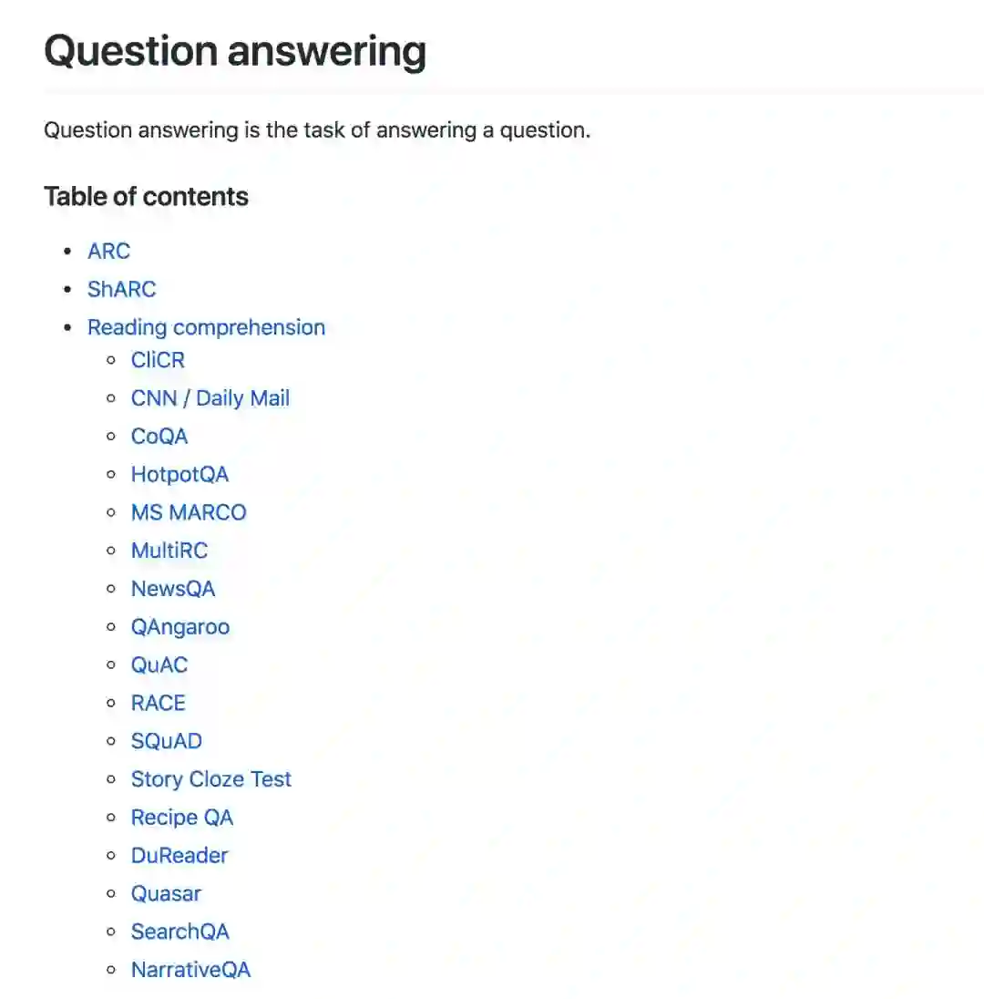对于每一个任务,NLP-Progress都会简单介绍一下这个任务是做什么的,并详细列出公开的标准数据集,以及在该数据集上各个模型目前的排名情况。比如,比较火的Question answering 问答系统任务,它的组织形式如下: