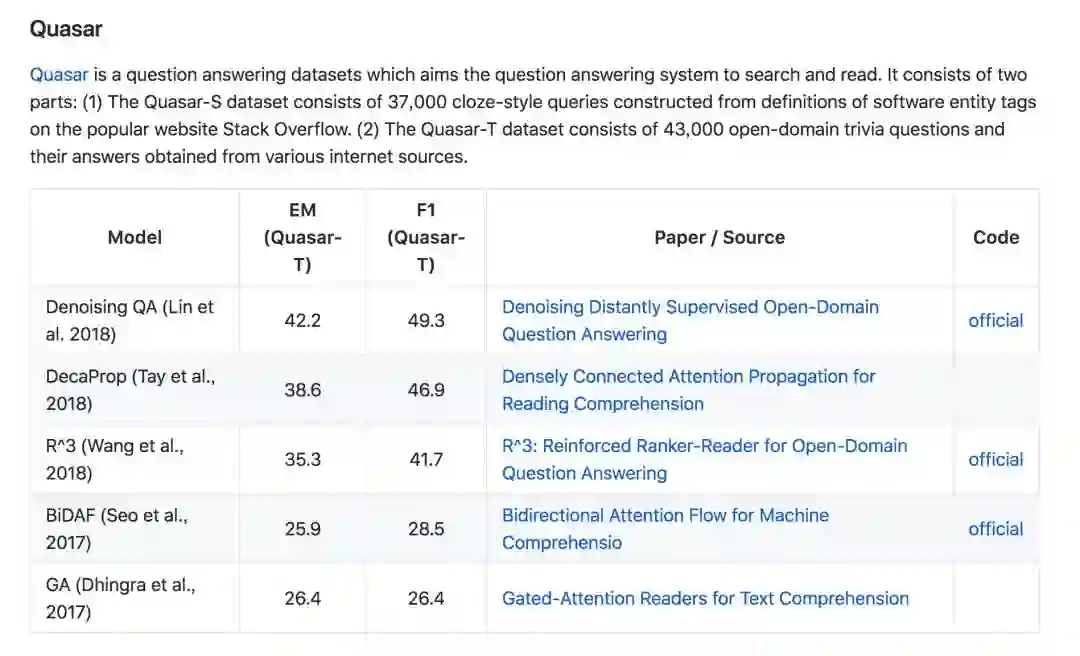 具体到某一个开放数据集,如 Quasar, 贡献者会简单介绍该数据集的组成,然后列出论文排行榜,其中每一行都包括:模型,效果,文章名和链接,以及代码链接。