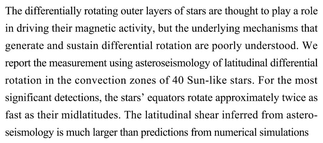 (导读 阿金)恒星外层的较差自转影响恒星的磁场活动,但是较差自传的产生和维持机制目前尚不清楚。本研究使用星震学测量40个类太阳恒星对流区的纬度较差自转,发现赤道旋转速度是中纬度区域的两倍,该数据远高于模拟预测数值。