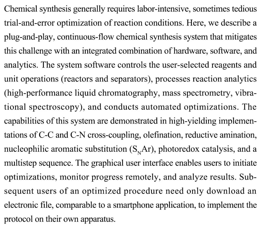 (导读 卓思琪)化学合成通常需要反复试错进行优化。本文描述一种即插即用、连续流动的化学合成系统。该系统软件控制用户选择的试剂和单元操作,分析反应进程,执行自动优化。用户可以通过图形用户界面进行优化操作、远程监视以及结果分析。而优化程序的后续用户仅需下载一个电子文件,就可以在自己的设备上实现协议。