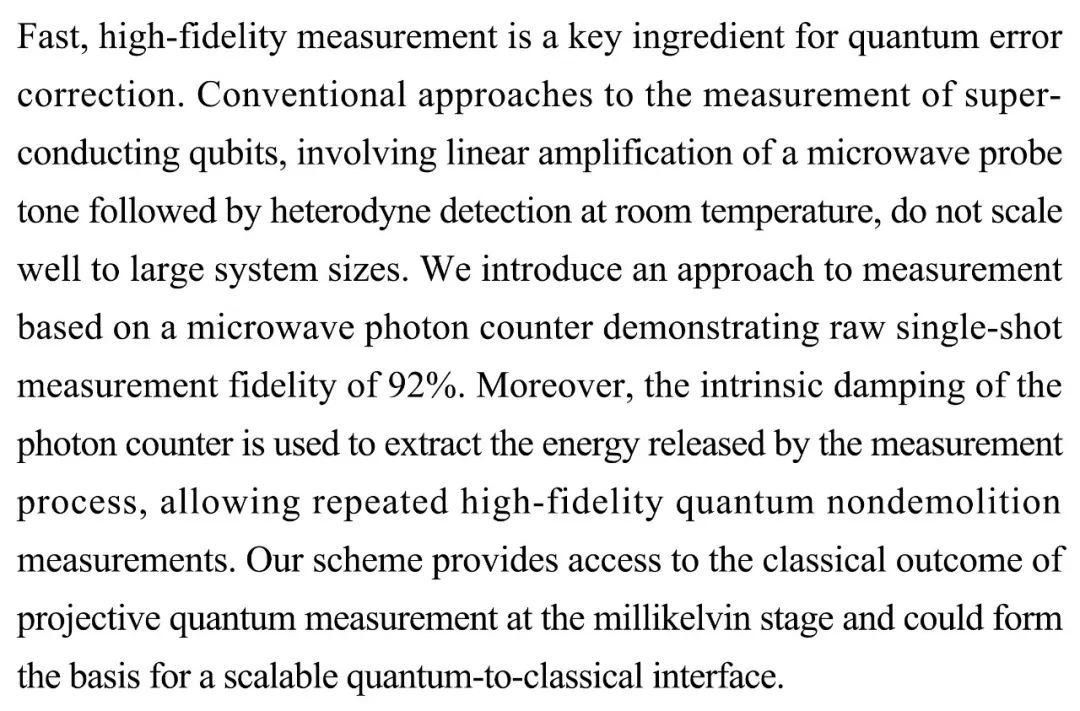 (导读 阿金)快速且高保真测量是量子纠错的关键,传统测量超导量子比特的方法无法应用于大尺度系统中。本研究引入一种基于微波光子计数器的测量方法,原始单次测量保真度为92%,其固有阻尼可用来提取测量过程中释放的能量,实现重复的高保真量子非破坏测量。研究结果能实现毫开尔文量级的测量,以及为量子到经典结果提供基础。
