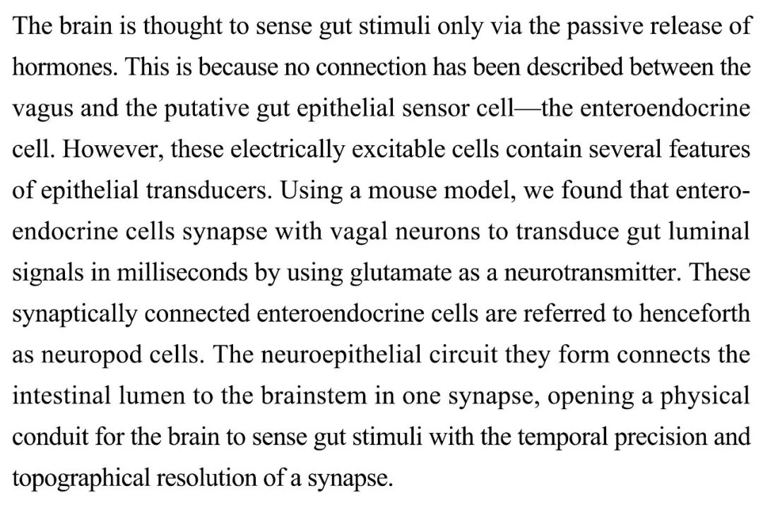 (导读 王思菲)过去一直认为大脑只能间接通过激素来感知肠道刺激。本研究使用小鼠模型发现,肠内分泌细胞与迷走神经元之间使用谷氨酸作为神经递质,在几毫秒内经由突触传导肠道信号。这些具有长足的肠内分泌细胞(neuropod cells)形成神经上皮回路,将肠腔信号透过突触直接传导至脑干,使大脑感知肠道刺激。