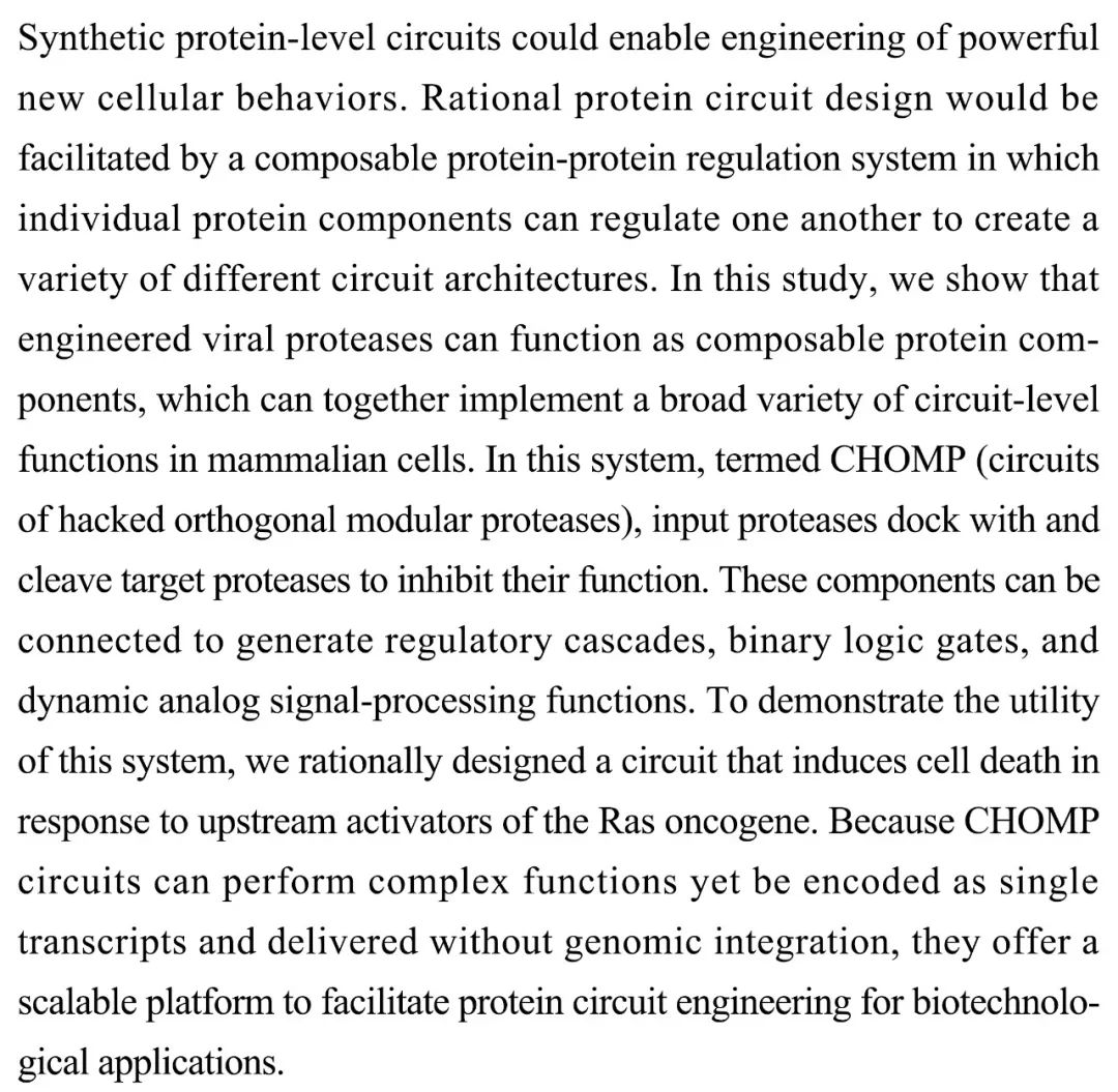 (导读 郭思瑶)可架构的蛋白质-蛋白质调控系统可以帮助构建蛋白质水平的合成回路。科学家发现改造过的病毒蛋白酶可以作为架构型蛋白质,在哺乳类细胞发挥多样回路水平的功能,依此开发了CHOMP回路系统。CHOMP应用可反应Ras上游激活剂并诱导癌细胞死亡。CHOMP的优势为通过单一转录本编码实行复杂功能,不需整合基因组,这将为蛋白质回路工程提供可扩展的有效平台。