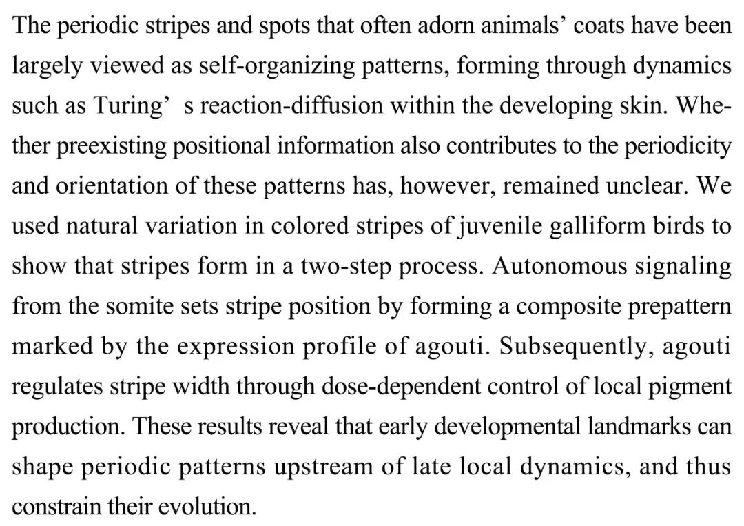 (导读 郭怿暄)研究者认为动物体毛的周期性条纹和斑点是通过图灵反应扩散模型在皮肤上自组织产生的,但图案的方向性和周期性是否由预先存在的位置信息决定尚不清楚。本研究利用幼年期鸡形目鸟类着色条纹的天然变异发现,来源于体节的自主信号通过agouti表达形成复合预模式来确定条纹位置,而agouti可剂量依赖地调控局部色素合成以控制条纹宽度。