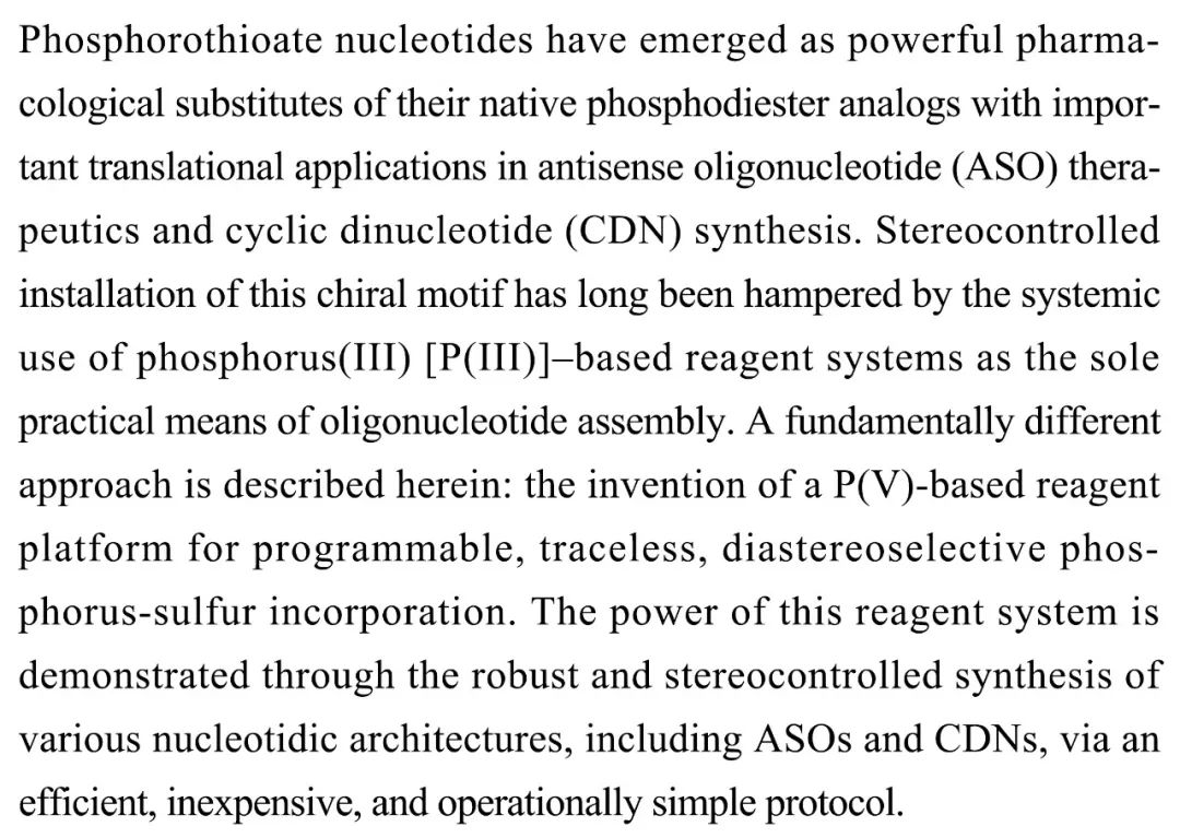 (导读 阿金)硫代磷酸酯核苷酸在反义寡核苷酸(ASO)治疗和环状二核苷酸(CDN)合成中发挥重要的翻译作用。本研究开发一种可扩展、可编程的基于手性PSI试剂的方法,能够精准调控硫代磷酸的立体化学合成。该试剂在不同核苷酸结构合成中表现出高效、廉价、操作简单的特性。