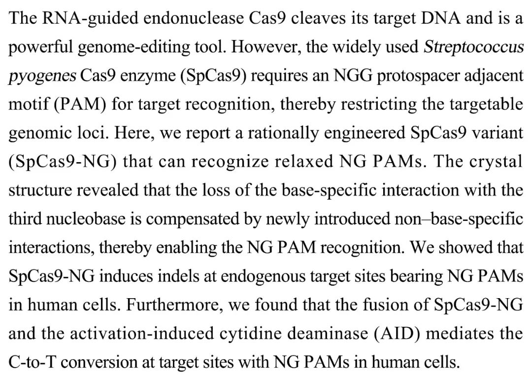 (导读 郭思瑶)RNA介导的核酸内切酶Cas9可作为强大的基因组编辑工具,而广泛使用的SpCas9需要前间区序列邻近基序(简称PAM)作为识别位点,科学家为了使其应用于更多的靶标,研究出了其改良的变体SpCas9-NG,由于丧失了碱基特异性相互作用,该变体可识别NG而非NGG碱基序列,这极大地增加了基因组编辑的靶标范围。