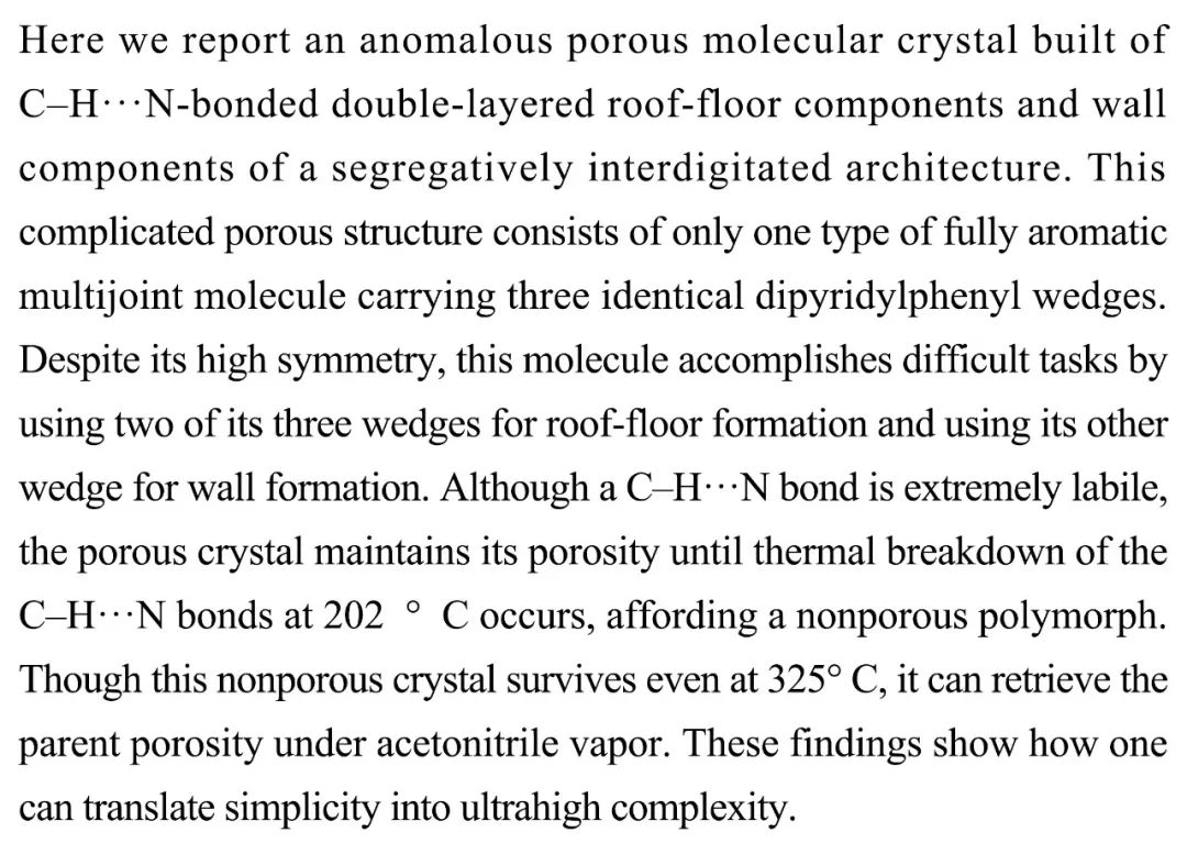 (导读 阿金)本研究报告由碳—氢n键结合的双层顶部-底部组件和隔离交叉的墙壁组件构建的多孔性分子晶体,该复杂结构仅有一种全芳香多联分子,具有高度对称性,且保持其孔隙率直到在202°C碳氢键发生热分解为止。该发现证明将简单性转变为超高复杂性的可能性。