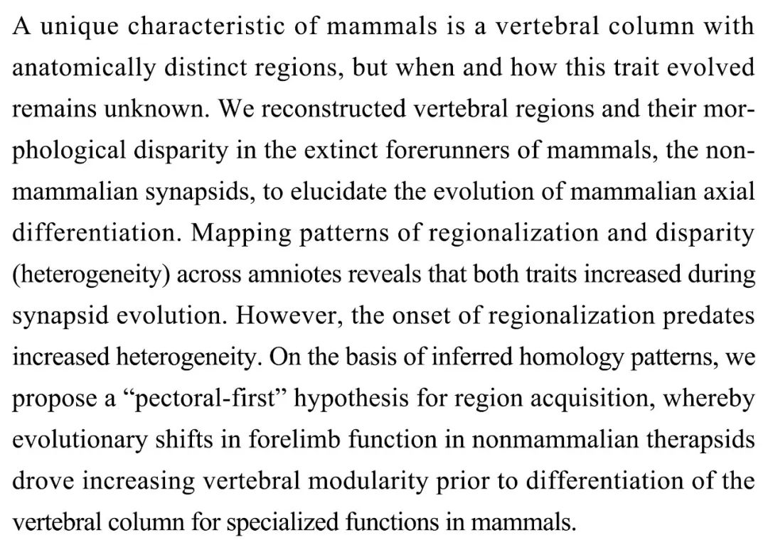 (导读 过泽远)区域化的脊椎是哺乳动物的独特特征,但是其演化时间和方式仍属未知。本研究通过重建已灭绝的哺乳动物祖先 --- 下孔类动物---的脊椎区域和形态差异来阐明哺乳动物的轴向分化。通过同源性模式的推论,研究人员提出一个“胸腔先进化”的假设:非哺乳类兽孔目前肢的进化导致脊椎的模块化优先于脊椎的分化而发生,赋予哺乳动物特殊功能。