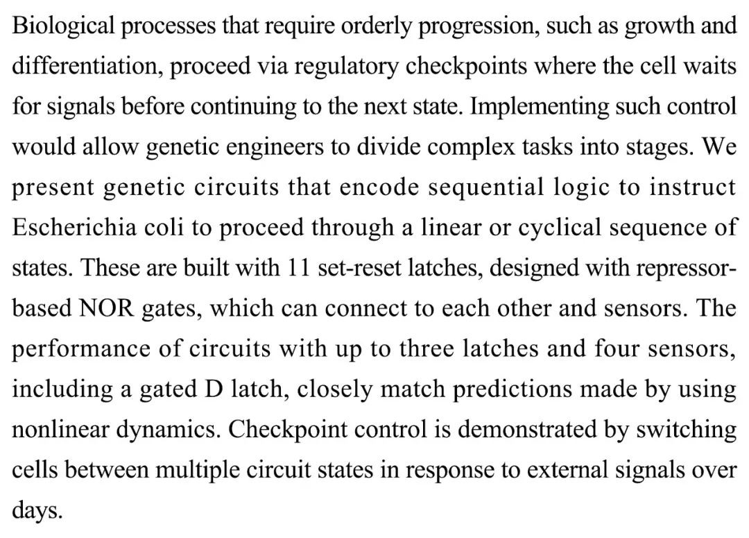 (导读 郭思瑶)生物进程需要调控检查点的信号释放才能有序进行。科学家基于抑制子的NOR门控来设计遗传回路,从而调控大肠杆菌。这个最多涉及到三个门闩和四个传感器零件的回路系统在细胞内的表现与预期十分相近。检查点调控通过多重回路的转换应对细胞外部信号刺激。