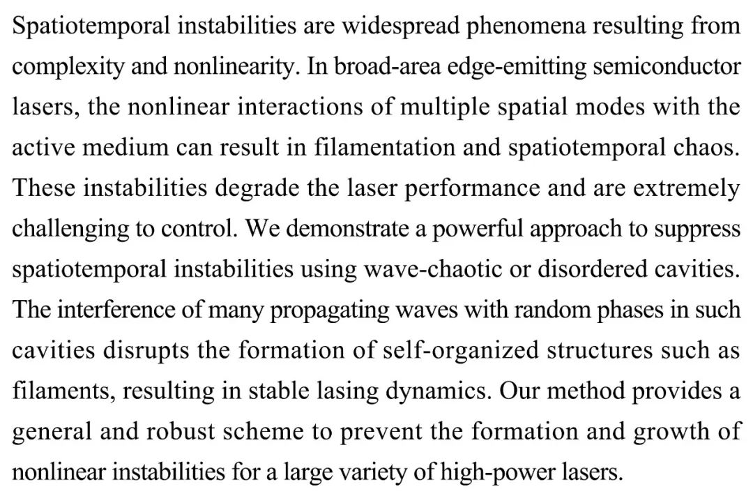 (导读 阿金)在边缘发射半导体激光器中多重空间模式和激活介质的非线性相互作用会导致成丝效应和时空混沌,从而降低激光器的性能。本研究使用波混沌/无序光学空腔来抑制时空不稳定,其中具有随机相位的波之间的干涉效应能使激射的动力学状态趋于稳定。研究结果提供了一种通用并稳健的方法来有效防止各种高功率激光器中的非线性不稳定性。