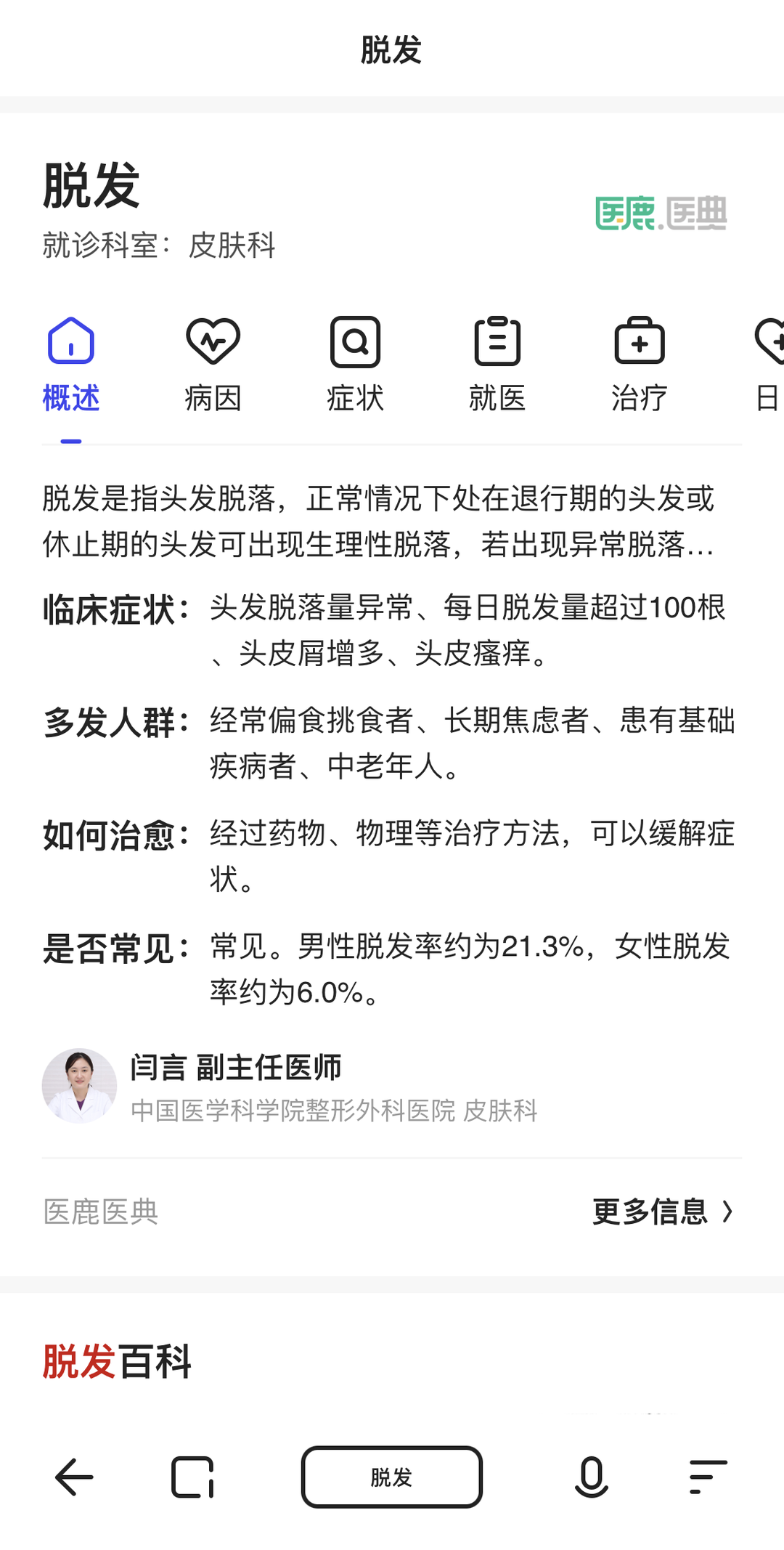 那么另一个健康部分,我觉得更值得分享了。特别在今年疫情的影响下,大家对健康的关注是越来越高了。比如今年很多ZEALER粉丝都留言担心老王的头发,我就用夸克帮老王查脱发试试,输入脱发,可以搜索来自中国医学科学院整形外科医生的诊断,从病因到治疗和日常护理,都非常详细。而且搜索结果里也没有竞价广告,更不会出现乱七八糟的虚假广告,伤钱伤身。所以大家可以放心用夸克查询健康相关的问题。