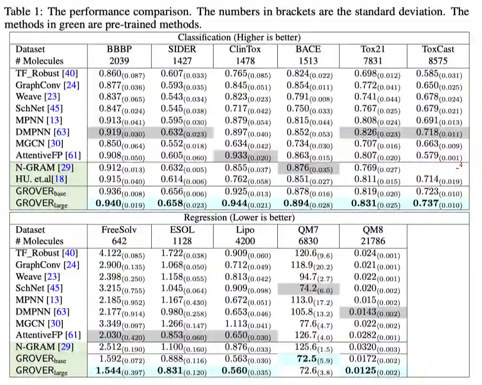 该论文探索了大规模(一千万个未标记分子数据、一亿参数)预训练GNN模型的潜力。利用自监督学习任务和提出的GTransfomer模型,GROVER可以从庞大的未标记分子数据集中学习到丰富的领域知识。通过对GROVER微调,可在11个benchmark上相比当前SOTA有不错的提升。