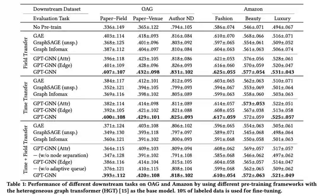 表中总结了在OAG和Amazon上使用不同的预训练方法在下游任务中表现出的性能。实验在预训练和微调阶段之间设置了三种不同的传输设置:分别使用来自2014年之前和2014年之后的数据进行预训练和微调(Time Transfer);将CS领域的论文用于下游微调,将其他领域的所有论文用于预训练(Field Transfer);在其他领域2014年之前的论文上进行预训练,并在CS领域2014年之后的论文上微调(Time+Field Transfer).总体而言,GPT-GNN框架显著提高了两个数据集上所有下游任务的性能。