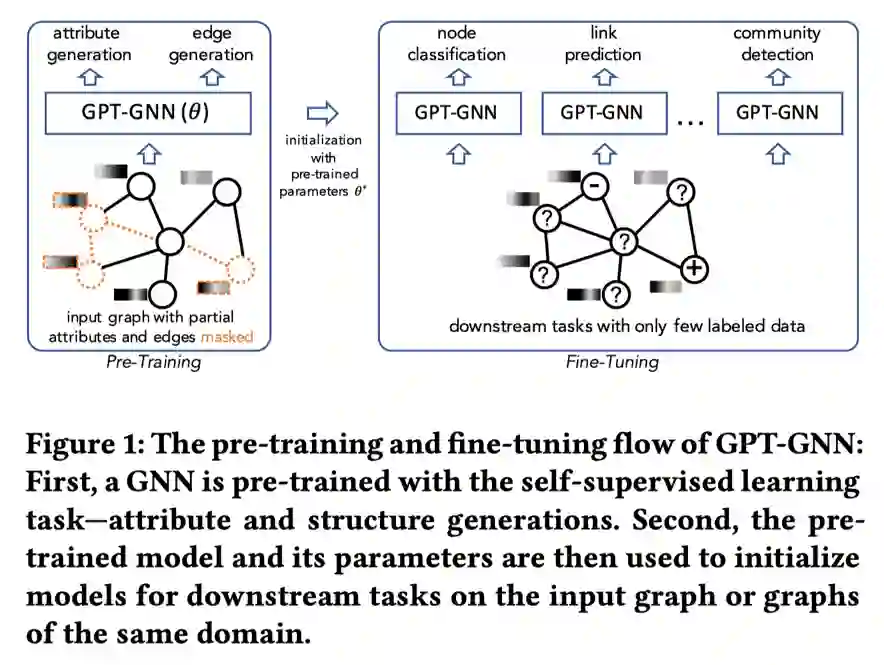 这篇文章提出的GPT-GNN通过生成式预训练的方式来初始化GNN,下图为GPT-GNN的预训练-微调流程。