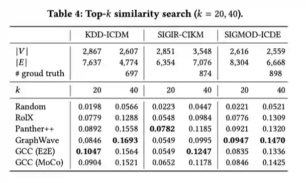 GCC可用于多种下游任务。本文探索了GCC在节点分类、图分类及相似搜索中的应用。具体地,在节点分类任务中,利用GCC预训练得到的编码器对节点的r-ego子图进行编码;在图分类任务中,对输入图直接进行编码;在相似搜索中,利用GCC分别对两个节点的r-ego子图进行编码,并计算编码后两者的距离作为相似度的度量。