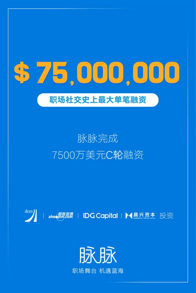 11月15日,实名制职场社交平台「脉脉」向创业邦透露,目前已经完成C轮7500万美元融资。本轮融资由DCM领投,IDG资本、晨兴资本继续跟投,同时还引入了智联招聘作为战略投资方。