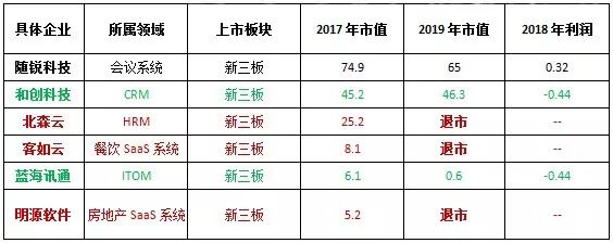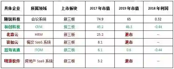 我们统计了典型的SaaS类新三板上市公司,结果发现除了随锐科技一家外,其余的企业要么亏损,要么退市。