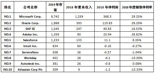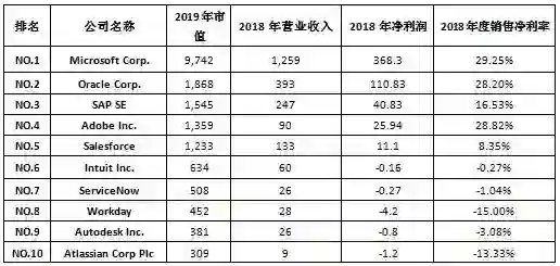 美国市值排名前十的上市SaaS企业(截至2019年6月,单位: