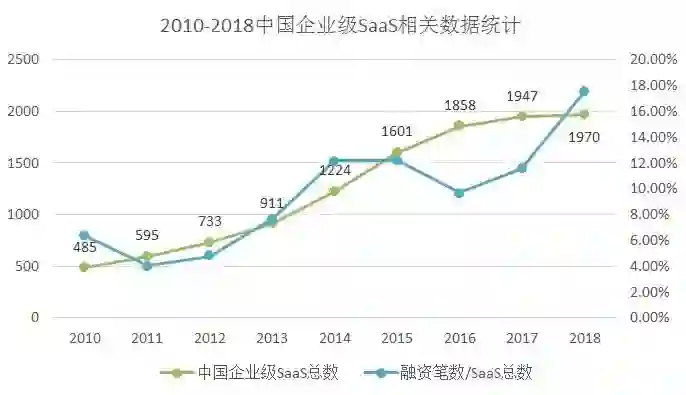 按照融资笔数/SaaS企业总数的口径,这个数据总体来看也是持续上涨的。