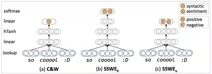 Tang等人使用这些语料,他们在普通的C&W模型基础上,引入情感得分相关的损失,将这些弱标注的情感信息融入词向量表示中,使“good”和“bad”这种上下文相近但情感不同的词的向量表示有明显的差异。