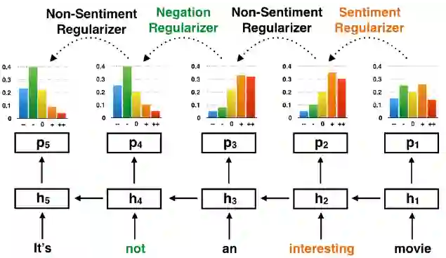 虽然上述工作在计算情感得分时,考虑了not、very等否定词、强化词的得分信息,但是没有显式把这些词对周围词的情感语义表示的影响刻画出来,Qian等人[3]考虑到情感词、否定词、强化词在情感语义组合过程中起到的不同作用,对文本建模过程中对不同位置词的情感分布加以约束。例如,若一个词的上文是not等否定词,会带来not处文本情感语义的翻转。