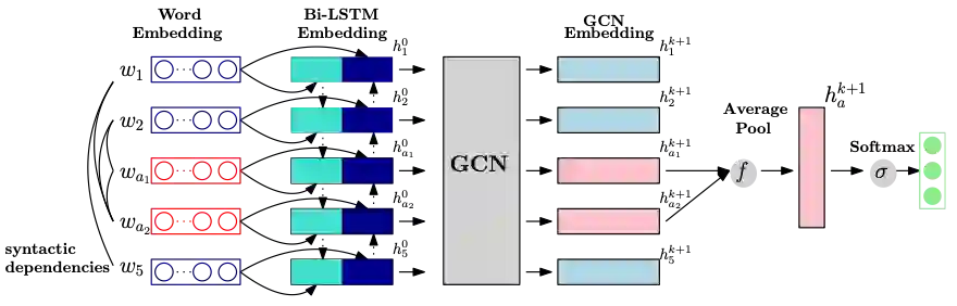 Sun等人[7]提出在面向属性的情感分类(ABSA)任务上,引入Stanford parser解析得到的依存树信息辅助识别评价对象相关的评价词。他们将GCN在依存树上学习得到的表示与BLSTM学习到的特征结合,判断句子针对评价对象的情感极性。
