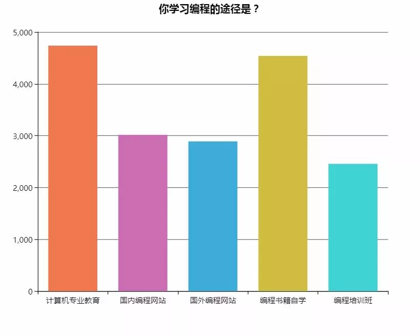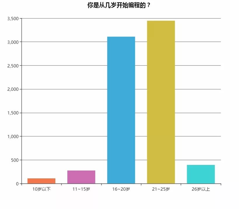 如图表所示,这 7000+ 名开发者当中,开始学习编程的年龄大部分分布在 16~25 岁之间,人数总和超过 6500 人。相较于国外开发者,国内开发者接触编程的年龄相对较晚。小编分析这是由于客观的经济发展状况以及国内互联网起步较晚的双重因素所致。随着国内经济的飞速前进,国内互联网行业也得到了跳跃式的发展,我们有理由相信国内开发者接触编程的年龄会越来越提前。