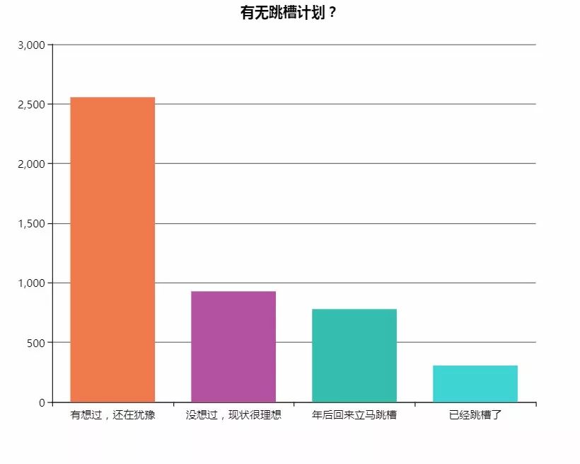 年前调查这个问题,可能会让许多管理者看到结果后感到不适。在参与调查的 4500 余份样本中,超过一半以上的人有想过跳槽,但还在犹豫中。只有五分之一的人对现状感到满意,无意跳槽。另有接近五分之一的人群打算年后回来就立刻跳槽。