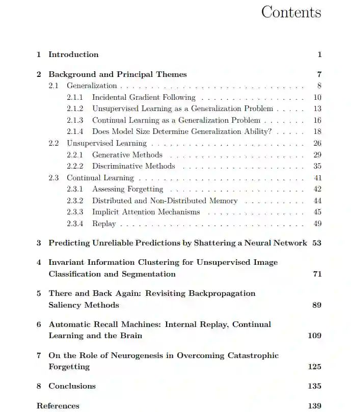 所有这些问题都与基本的泛化问题有关,泛化是指尽管面向新类但仍能表现良好的能力。在第二章中,我们讨论了在有监督、无监督和持续学习环境下,可以预期产生良好泛化的条件,包括小模型大小和训练和测试数据之间的相似性。第三章提出了一种预测模型何时不能泛化到测试样本的方法,推导出泛化边界,利用模型大小和与训练数据的相似度来量化预测的可靠性。第四章介绍了一种聚类方法,该方法学习了如何在语义概念之间近似地分离数据,使用的是非监督目标不使用手动标签。第五章包含了一种不需要专门训练数据就可以执行目标定位任务的方法,即通过重新利用显著性映射。第6章包含了一个持续学习的方法,在这个方法中,模型被迫重新考虑之前的知识与新知识并行,第7章使用了一个动态架构来抑制新学习片段对旧知识的干扰。如果没有这些泛化问题的解决方案,神经网络就无法从自然顺序的、没有注释的现实世界数据中实时有效地学习,这限制了它们的部署选项。因此,泛化是一个具有巨大实际意义的问题,从理论上和从生物学启发学习的角度来看都很有趣。