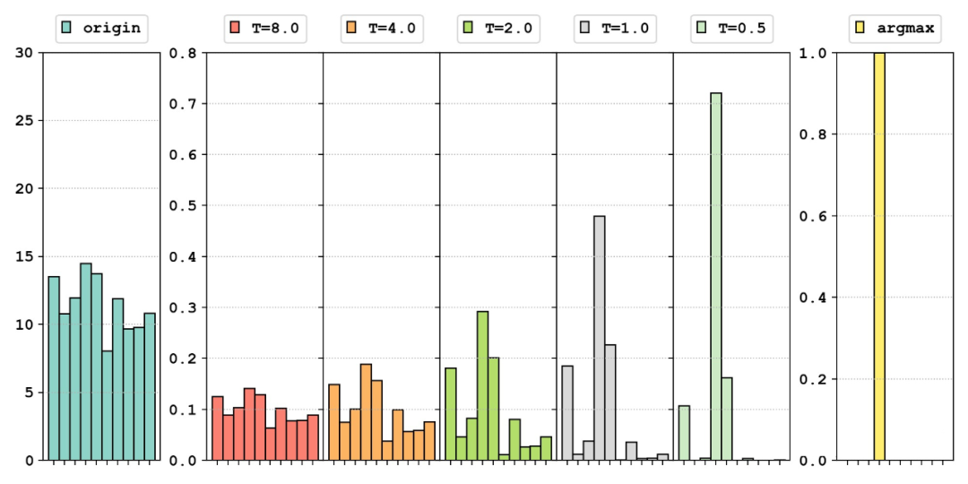 时相当于原始的 softmax;右侧对比了 argmax 得到的结果。可以看出,从左到右,这些输出结果逐渐从均匀分布向尖锐分布过渡,其中保留的除正确类别以外的信息越来越少。下图