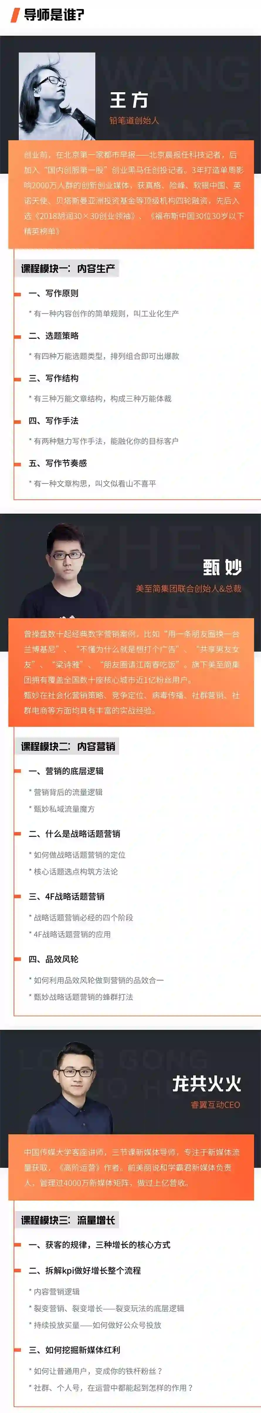 睿翼互动CEO 龙共火火:中国传媒大学客座讲师,三节课新媒体导师,专注于新媒体流量获取,《高阶运营》作者。前美丽说和学霸君新媒体负责人,管理过4000万新媒体矩阵,做过上亿营收。因其讲课干货多,时间长,被称为“新媒体最持久的男人”
