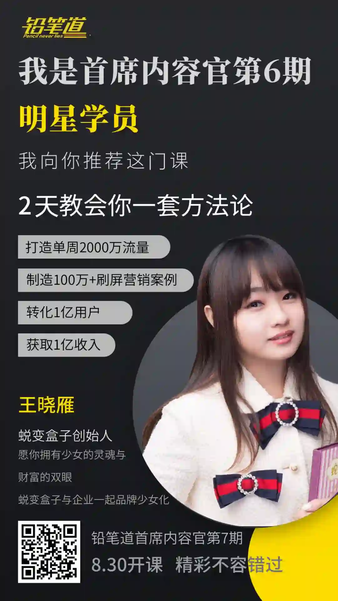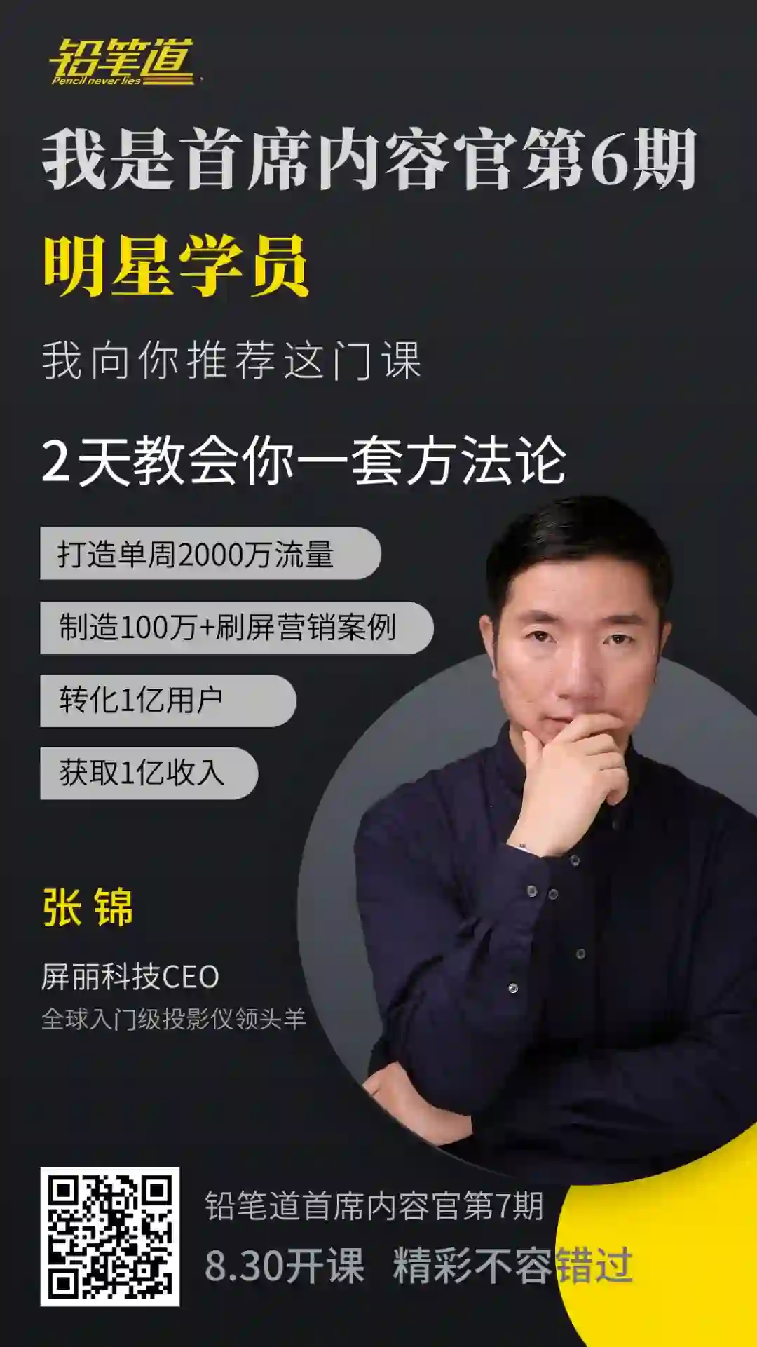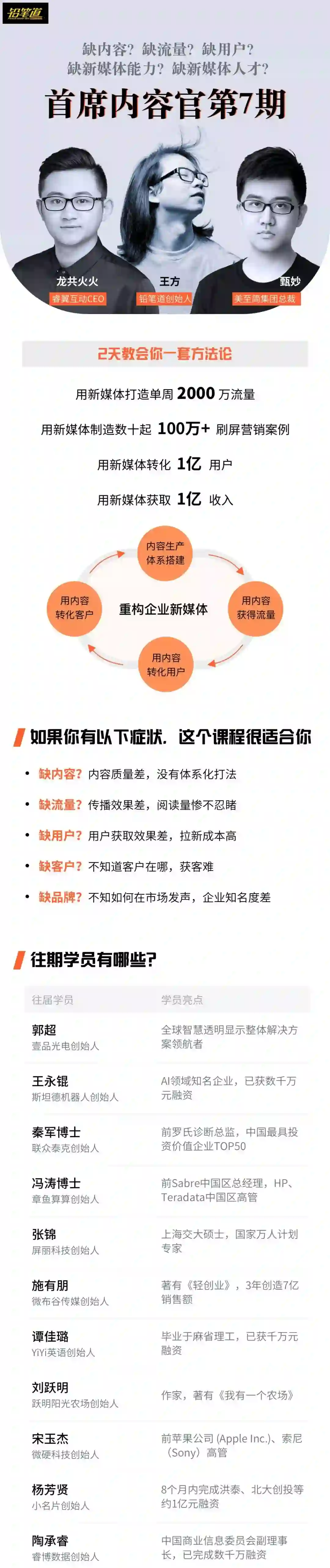 不仅如此,内容官训练营一直以来被无数学员给予肯定和好评,这次更是有第6期课程的明星学员张锦(国家万人计划专家、上海交大硕士、屏丽科技创始人)写下代言词,表白首席内容官: