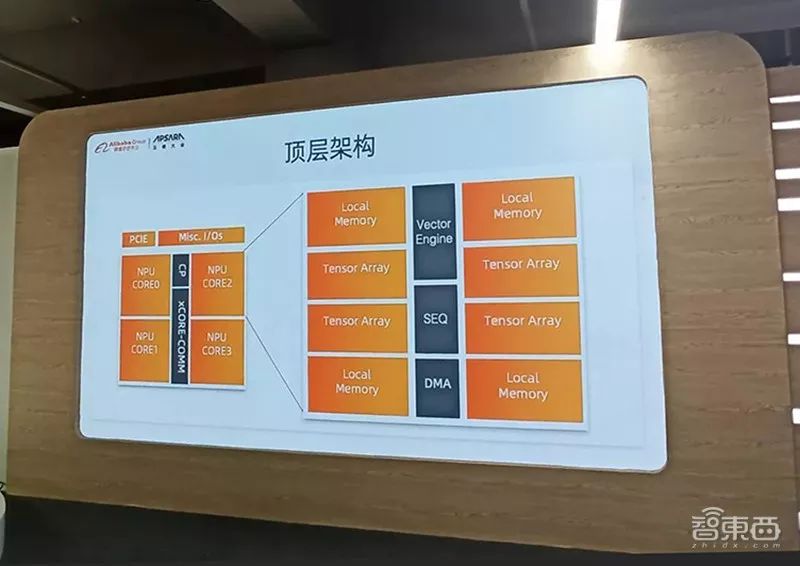 含光800采用平头哥自研芯片架构,集成达摩院算法,配以自动化开发工具。其顶层架构采用四核设计,任一NPU Core坏死,都不会影响芯片工作。