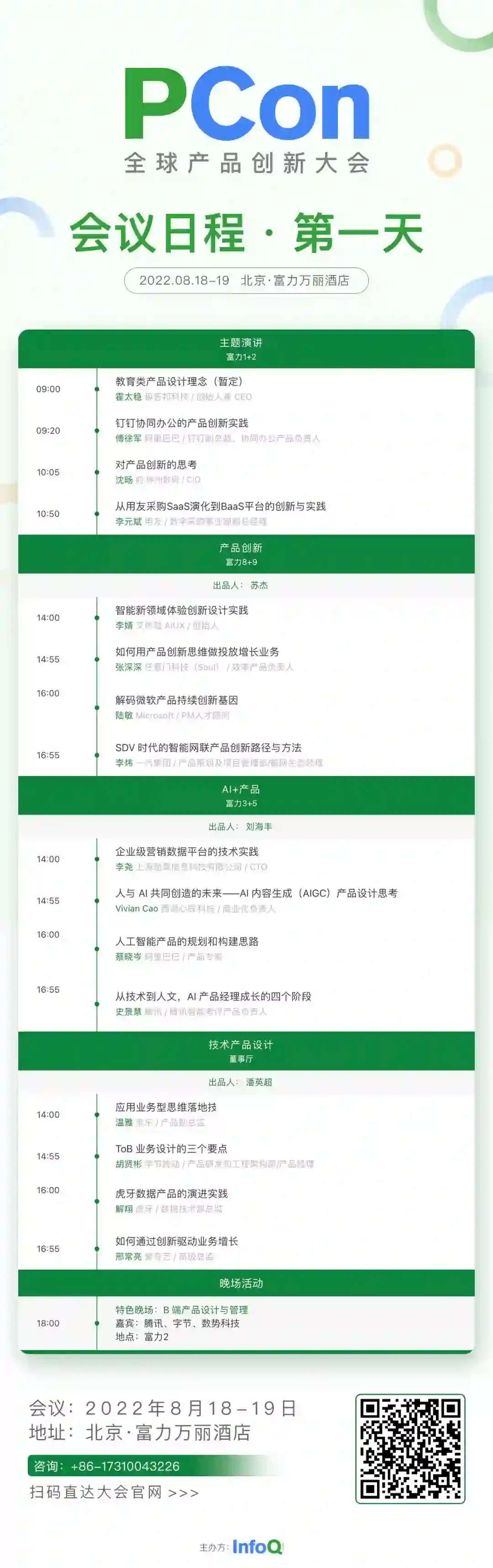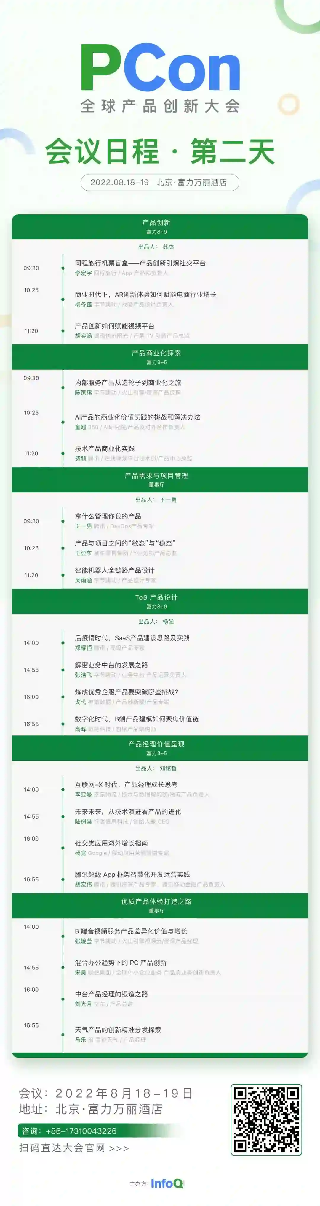 本次大会的 9 个产品专场分别以【产品创新】【AI+ 创新】【技术产品设计】【产品需求与项目管理】【产品商业化探索】【ToB 产品设计】【产品经理价值呈现】【经典产品案例】等主题展开分享。具体分享内容,可通过下方海报扫码或点击底部【阅读原文】查看大会全部日程,期待与你现场交流。