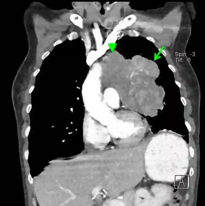 图1 胸部CT冠状位,SLLC累及左上肺叶(绿色长箭头)并延伸入纵膈(绿色短箭头)