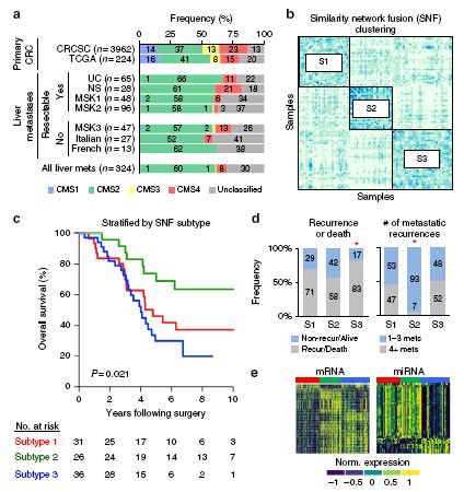 图2 CRCLM内源性分子亚型的鉴定。a CMS;b SNF分子分型;c 不同分子分型的总生存;d 不同分子分型的转移复发模式;e 不同分子分型mRNAs(左)和miRNAs (右) 表达不同