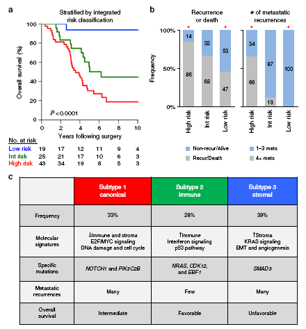 图4 根据分子亚型和临床风险分层的整合分型。a 有限新发CRCLM肝脏手术后,不同整合分型的总生存;b 不同整合分型的转移复发模式;c 结直肠癌肝转移整合分型