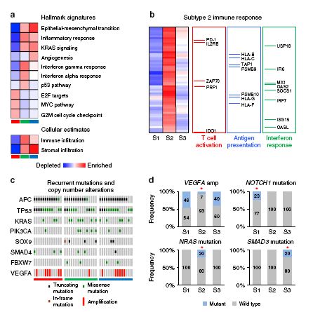 图3 CRCLM分子分型的分子特征。a 各分子分型的特征变化; b 分子亚型2中过表达的免疫基因功能分类;c 各分子分型再现性结直肠癌突变和拷贝数改变;d 各分子分型特异性基因组改变频度